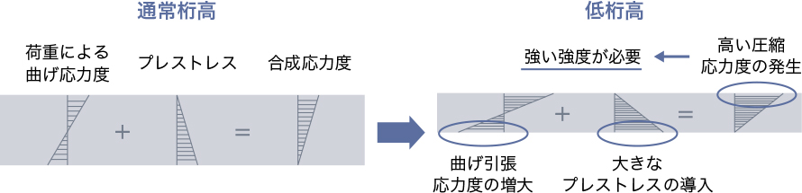 「ダックスビームHC」は、設計基準強度100N/mm2の高強度コンクリート(ダックスコンクリート)を用いることで、桁高支間比が1/25以下の低桁高PC 桁橋を提供するために開発されたものです。高強度コンクリートを使用することで、主桁に大きなプレストレスを導入することが可能となり、桁高の低減を図ることができます。