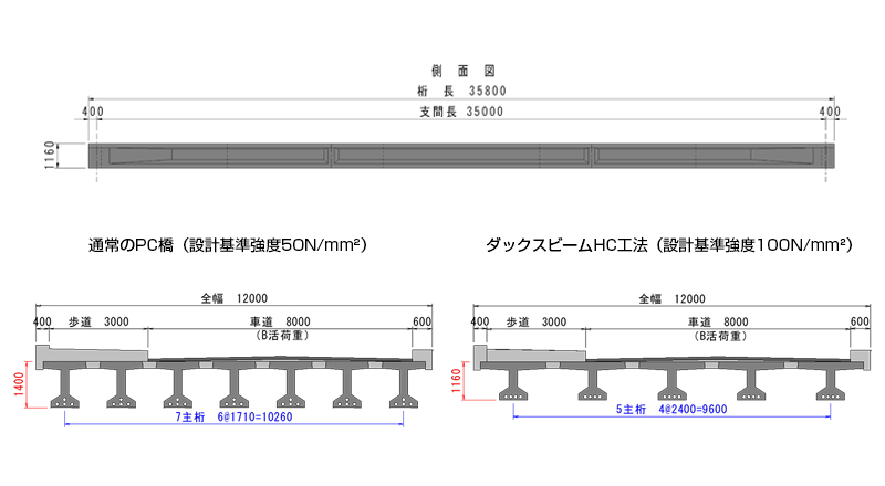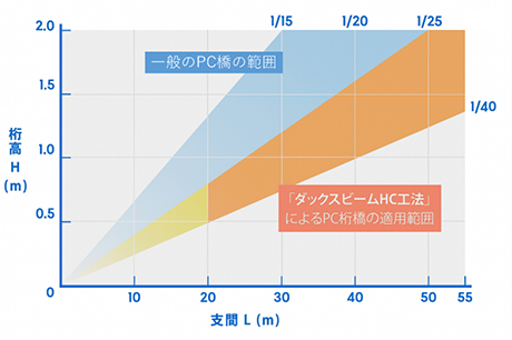 一般的なPC橋(設計基準強度50~60N/mm2)の桁高支間比は1/15~1/25程度ですが、ダックスビームHCでは桁高支間比1/25~1/40程度の低桁高PC橋が実現可能です。