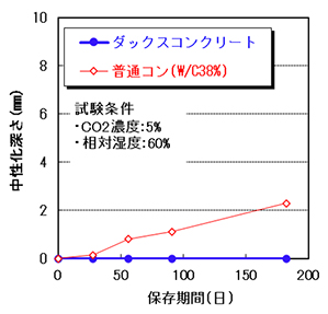 ダックスコンクリートは、182日の促進中性化試験でも中性化深さは0mmであり、極めて優れた中性化抵抗性を有しています。