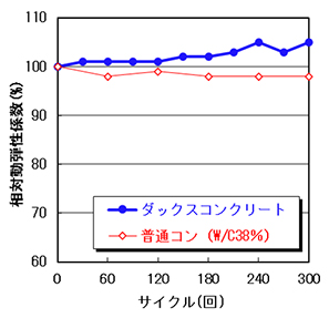 ダックスコンクリートは、300サイクルの凍結融解試験でも相対動弾性係数の低下はほとんどなく、極めて優れた凍結融解抵抗性を有しています。