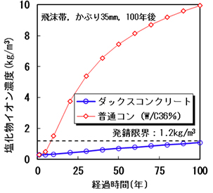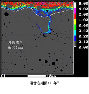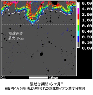 EPMA分析より、浸漬期間が6ヶ月および1年における塩化物イオンの浸透深さに大差はなく、浸漬期間が6ヶ月以降は塩化物イオンの浸透が抑制されることが確認しました。また、ダックスコンクリートの塩分拡散係数は、普通コンクリートの1/5以下であり、かぶりが35mm程度であれば、飛沫帯においても100年間の耐久性を有しています。